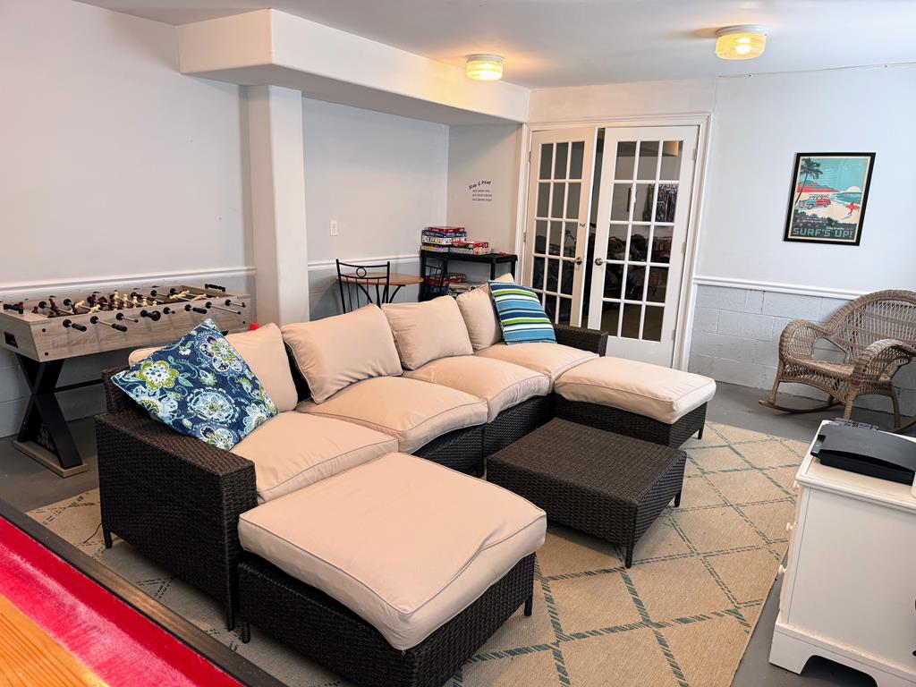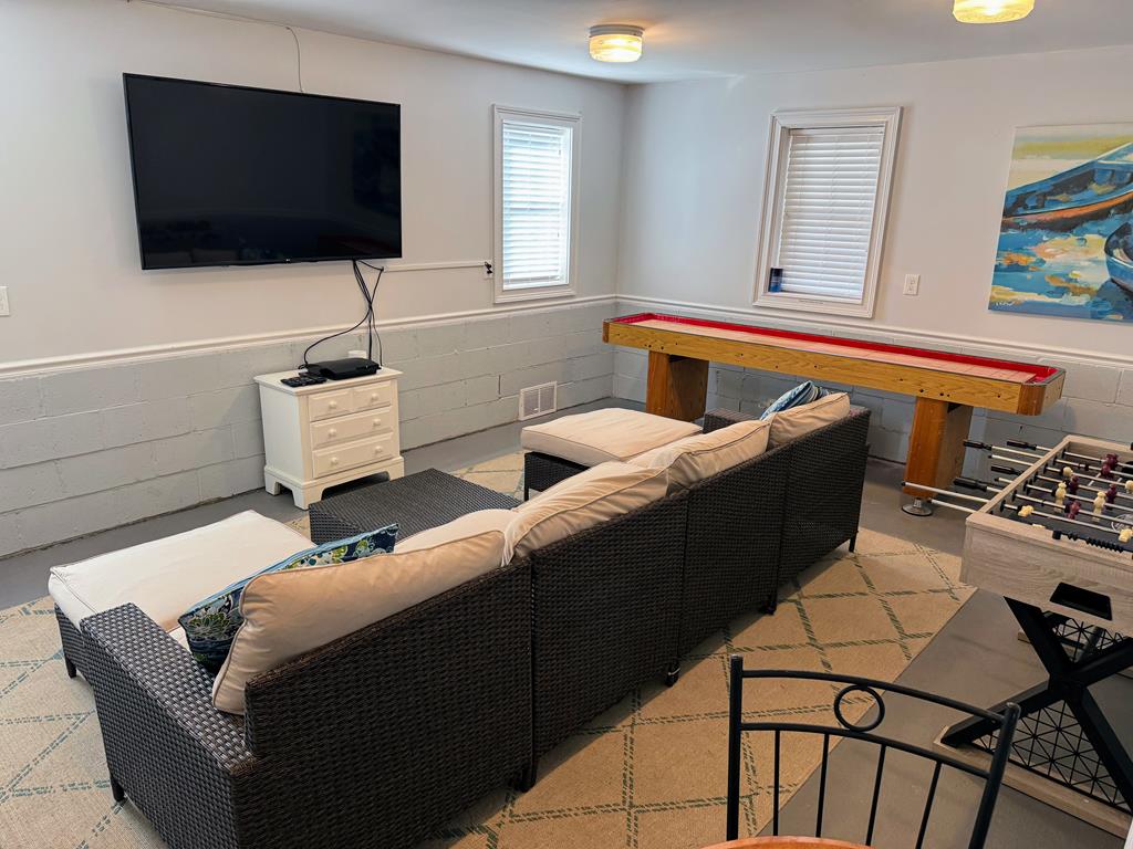 This beautiful beach house is open and spacious so you can spend your vacation in comfort with family and friends- it even has a bonus game room! And itfs perfectly located a short walk to the boardwalk, beach, shops and restaurants. Open floor plan living/dining/kitchen with granite countertops, stainless steel appliances and a gas fireplace. Big screen gsmarth televisions in the living and game rooms with wireless internet are ready for downtime or movie night. Shuffleboard and foosball tables make the game room even more kid-friendly!